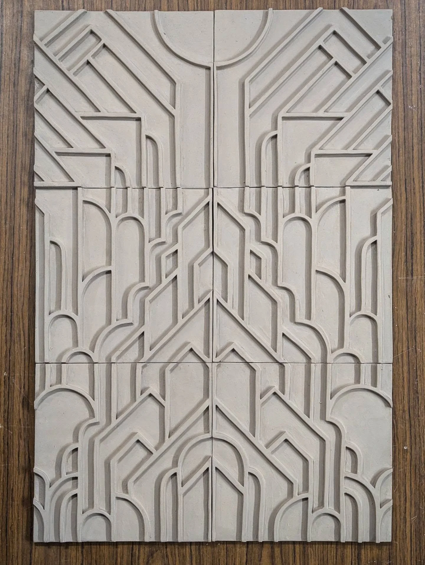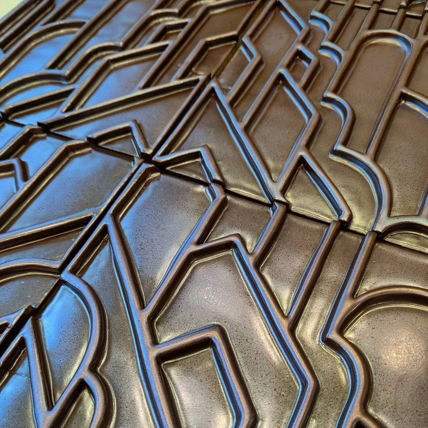 My work is hand built from flat slabs of clay. The textures are created using custom CNC milled stamps. The work is wood fired and then reduction cooled. Reduction cooling is the process of firing the kiln down in a reduction atmosphere after reaching temperature. This down firing creates an oxygen starved flame that begins to burn the oxygen molecules contained within the iron in the clays. This chemically changes the iron, providing deep rich, reds, metallic copper, bronze and black colors. It can also cause the wood ash to sparkle as if the work was sprinkled with sugar.